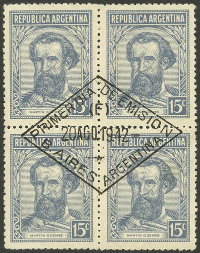 15c. Martín Güemes, block of 4 with first day pmk, VF (Image)
