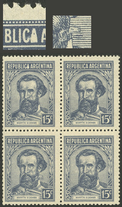 15c. Güemes, without watermark, block of 4, 2 with varieties: White spot on "A" of REPUBLICA and the other one with retouch in lined background beside the face, VF