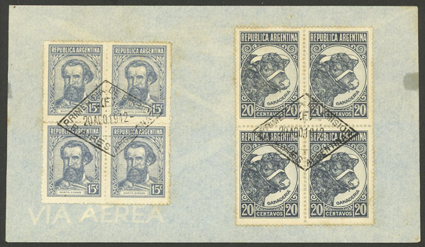 883, 15c. Güemes and 20c. Bull, in blocks of 4 on envelope with first day postmark, VF (Image)