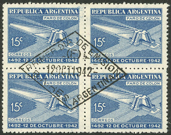 15c. Discovery of America 450 years, straight rays wmk, block of 4 with first day pmk, VF (Image)