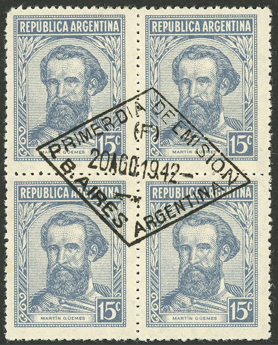 15c. Güemes, straight rays wmk, block of 4 with first day postmark, VF (Image)