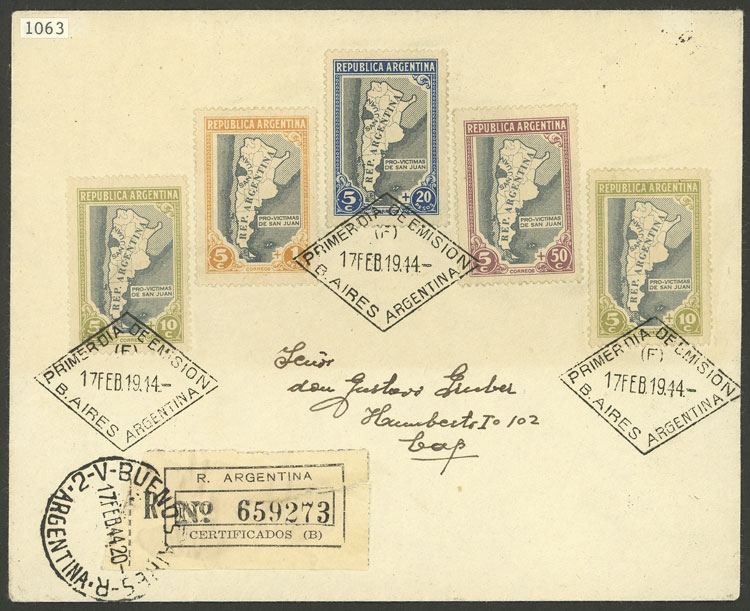 GJ.912/5, San Juan earthquake victims, cmpl. set of 4 values franking a registered cover used in Buenos Aires on 17/FE/1914 (first day postmark), VF