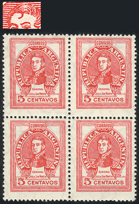 5c. San Martín, block of 4, one with variety: Curl on the forehead, VF (Image)
