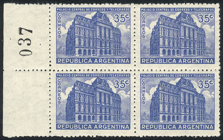 35c. Central Post Office, straight rays wmk, block of 4 with numbered sheet margin, VF quality (Image)
