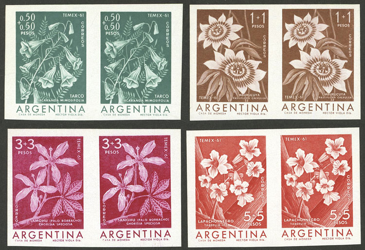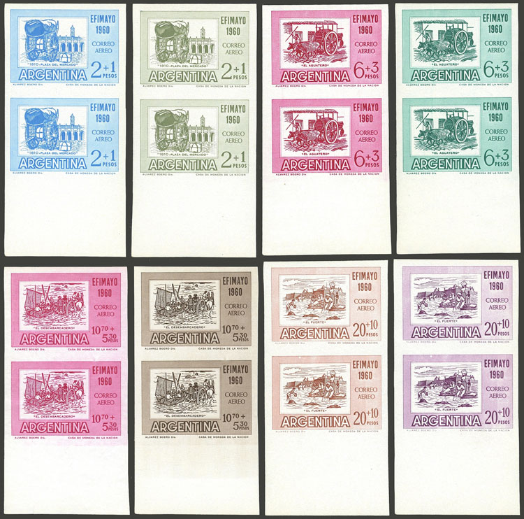 GJ.1183/6, airmail, Inter-American Philatelic Expo, "EFIMAYO 1960", 2 color proofs of each value of the set, on chalky paper with gum, in marginal pairs, VF