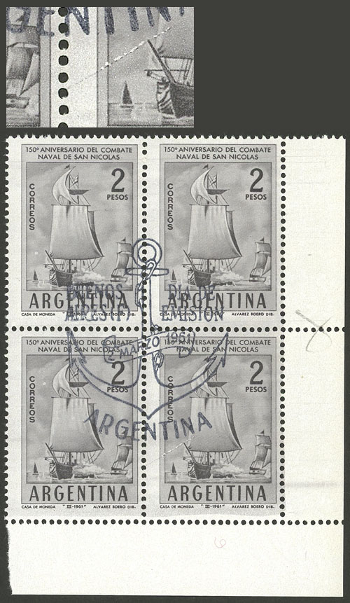GJ.1208a, 2P. Battle of San Nicolás, corner block of 4, one with variety: Plate flaw, with first day postmark, VF (Image)