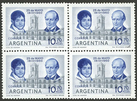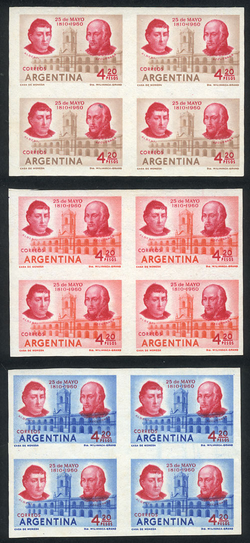 4.20P. May Revolution 150 years, proofs in 3 different color combinations, blocks of 4 on chalky paper with watermark, mint without gum, VF (Image)