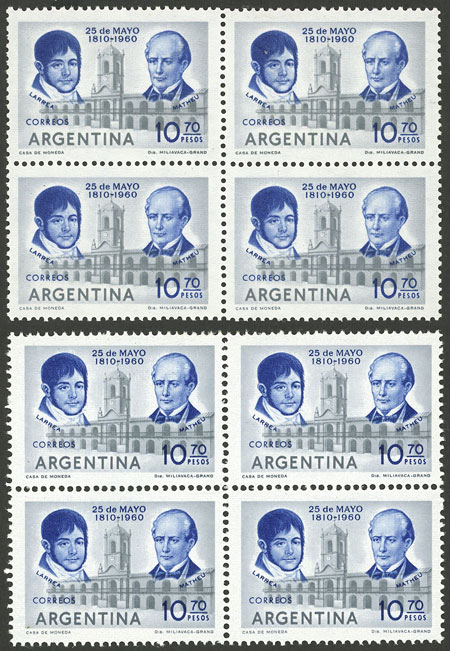 + 1174A, 10.70P. May Revolution 150 years, chalky paper with horiz watermark and glazed paper with vertical wmk, in blocks of 4, VF (Image)