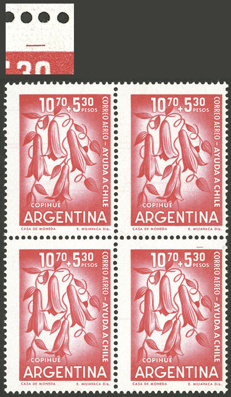 GJ.1189a, airmail, 10.70+5.30P. Flowers, Help for Chile, block of 4, one with variety: Small line in the border above "5,30", VF quality (Image)