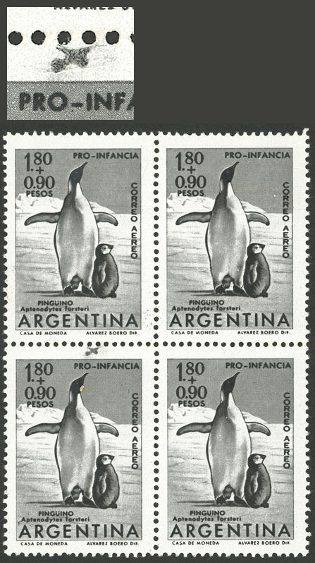 GJ.1206a, airmail 1.80+0.90P. Penguin, Children, block of 4, one with variety: Cross in the top border, VF (Image)