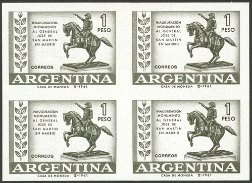 GJ.1216P, 1P. Inauguration of Monument to San Martín, imperforate block of 4, VF quality, very rare! (Image)