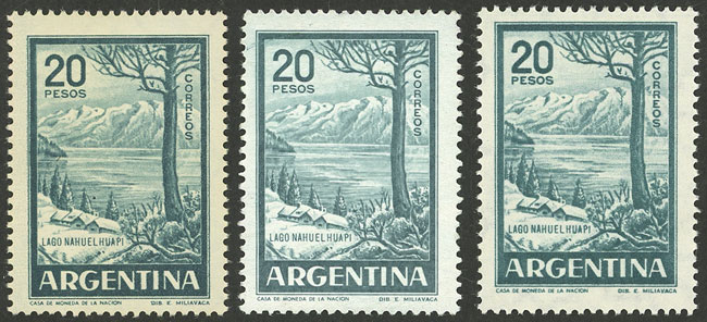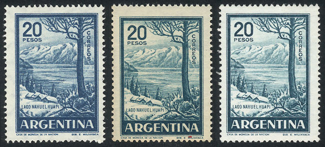1145A + 1145B, 20P. Nahuel Huapi, on imported unsurfaced paper (lightly hinged), national unsurfaced paper (MNH) and national chalky paper (MNH), VF (Image)