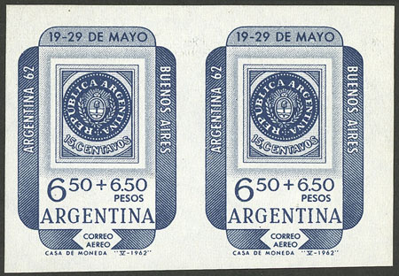 airmail, 6.50+6.50P. Argentina 62 philatelic expo, proof in blue, on glazed paper with watermark and gum, pair, VF (Image)
