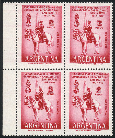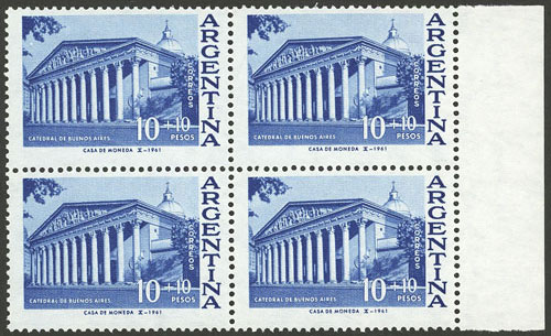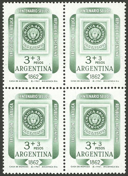 GJ.1223A, 10+10P. Argentina 1962 intl. philatelic exhibition, glazed paper with vertical wmk, marginal block of 4, VF (Image)