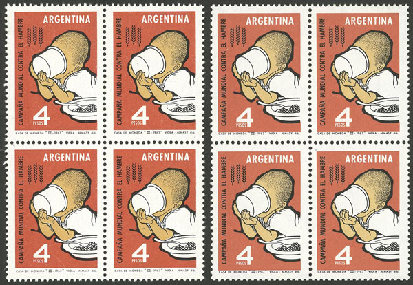 + 1250A, 4P. Freedom from Hunger, glazed paper with horiz watermark and chalky paper with vertical wmk, in blocks of 4, VF (Image)