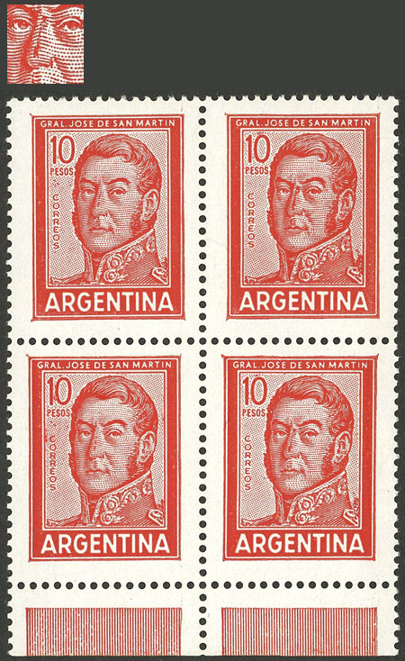 10P. San Martín, typographed, block of 4, all with variety: streak on the nose (different sizes), VF (Image)