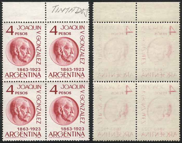 Joaquín V. Ganzález 4P., block of 4 with offset impression on back, VF quality (Image)