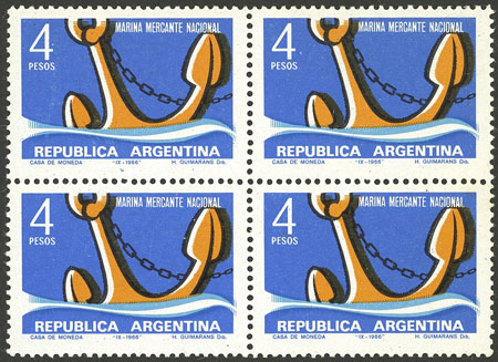 4P. Merchant Navy, block of 4 with variety: Yellow and light blue shifted, VF (Image)