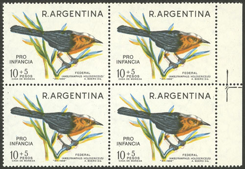 10+5P., Federal bird, Pro-Children, marginal block of 4 with variety: Shifted colors, VF (Image)