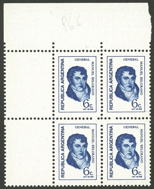 GJ.1524CZ, 6c. Belgrano, block of 4 with 2 left labels and sheet margin, very rare, VF quality (Image)