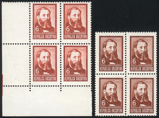 Hernández $6, block of 4 in very interesting bright red color, along a normal block for comparison, VF quality (Image)