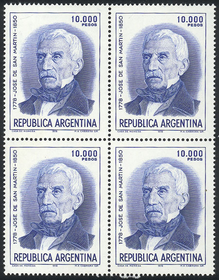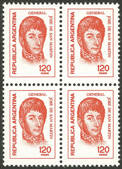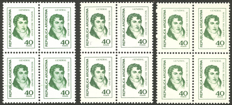 + 1756A + 1752B, 40P. Belgrano, chalky paper, fluorescent unsurfaced p. and phosphorescent unsurfaced p., in blocks of 4, VF (Image)