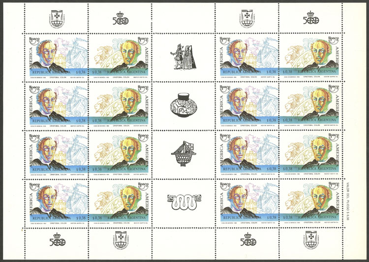 GJ.2617/8EN, Discovery of America 500 years, 8 sets with 4 different gutters (complete sheet), VF (Image)