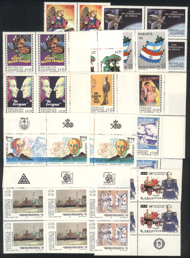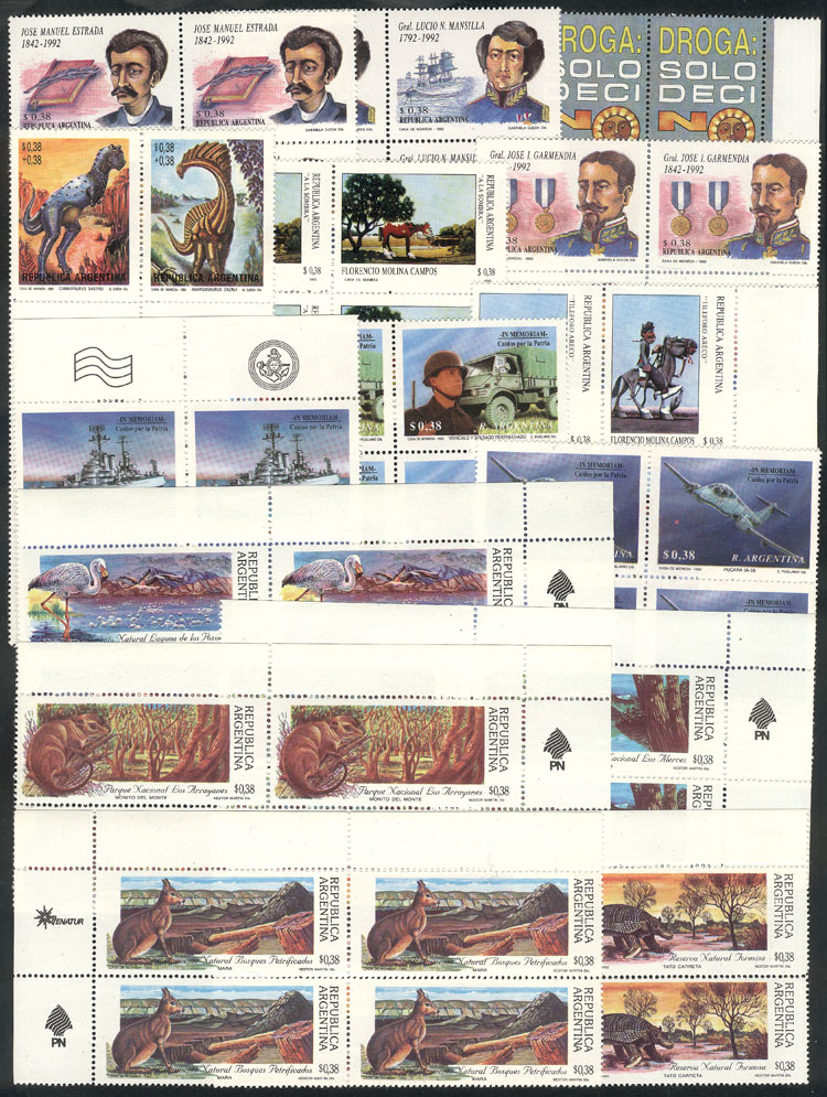 GJ.2583/90 + 2602/5 + 2610/26 + 2633, commemorative stamps issued in 1992 (not including the stamps from the souvenir sheets), in blocks of 4, ALMOST ALL of VF quality (Image) (Image-02)