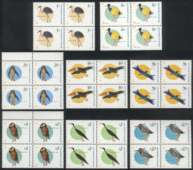 + 2725/8, 5c, 10c, 25c, 50c, 75c., $1, $2 and $2.75, Birds basic set in blocks of 4, VF (Image)