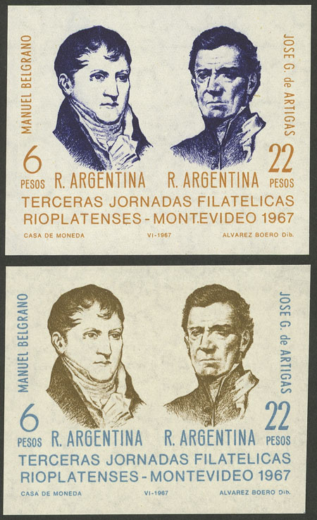 23, 3rd River Plate philatelic meetings, 2 proofs in different colors printed on national unsurfaced paper, with watermark and gum, VF (Image)