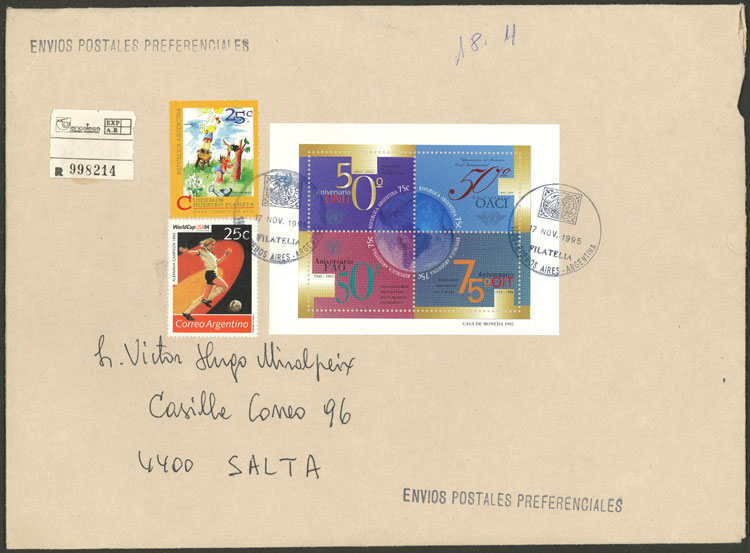 110, United Nations 50 years, on cover sent from Buenos Aires to Salta on 17/NO/1995, total postage $3.50, VF quality (Image)