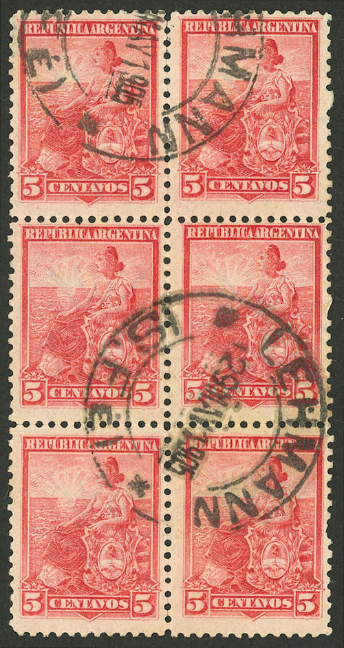 5c. Liberty PERFORATION 12, block of 6 with rare "LEHMANN (S.FE)" cancel, excellent! (Image)