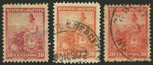 GJ.253/6, 30c. Seated Liberty, perf 12¼, in rose, dull vermilion and bright red, used, VF (Image)