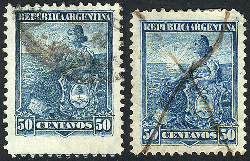 Seated Liberty 50c., perf 12¼, 2 used examples, one pen cancelled (with defect) and the other one taller due to perforation variety (salto de peine) (Image)