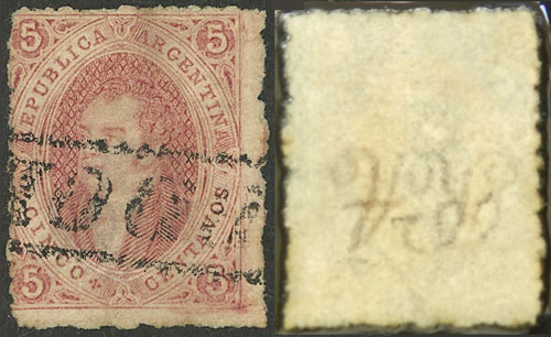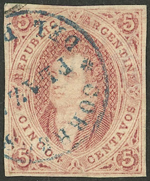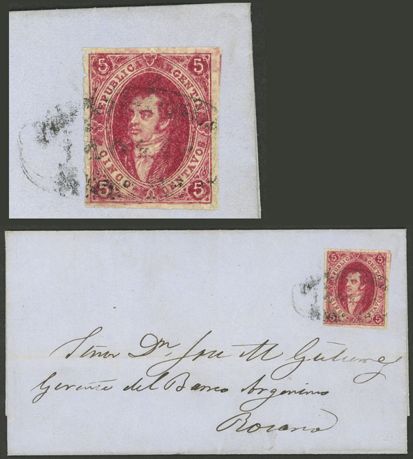 5th printing, CERISE-CARMINE franking a folded cover sent to Rosario on 7/OC/1867 with ellipse SAN JUAN cancel (+100%), excellent quality, low start! (Image)
