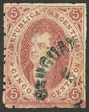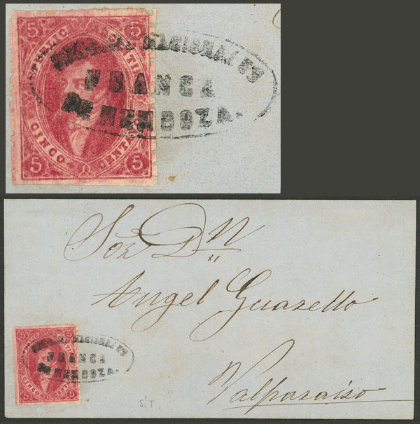 5th printing, light carmine, franking a folded cover sent to Valparaiso on 12/NO/1867, with ellipse "MENDOZA-FRANCA" cancel (+30%), superb! (Image)