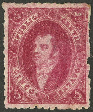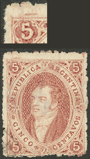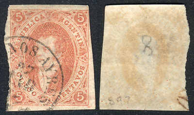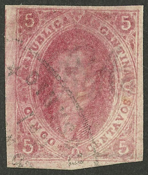 printing imperforate, orangish dun red, slightly parchment-like paper, used in B.Aires (very rare!), wide margins, very good example! (Image)