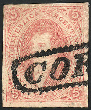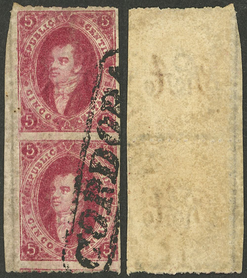 VERTICAL PAIR: GJ.26Ab, 5th printing, cerise carmine, on parchment-like paper, splendid vertical pair with left sheet margin and almost complete straightline "CORDOBA" cancel, superb! NOTE: Vertical pairs are much rarer than horizontal ones. (Image)