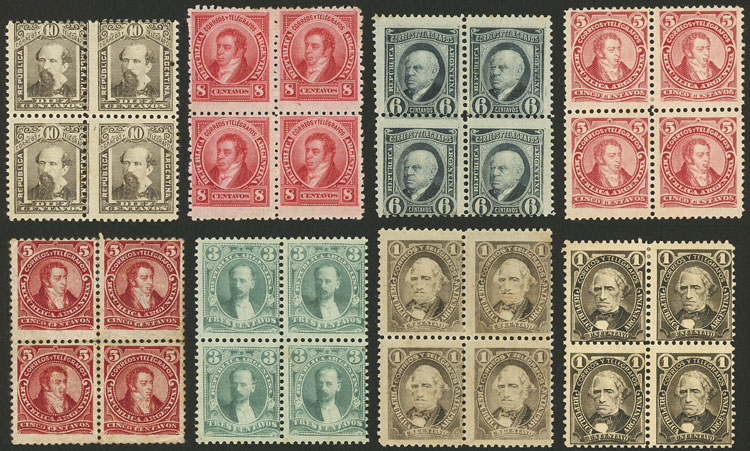 101 + 103 + 106 x2 + 108/110, 7 values of the set in blocks of 4, the 5c. in 2 different shades, one with minor defect on the gum, in general of fine quality