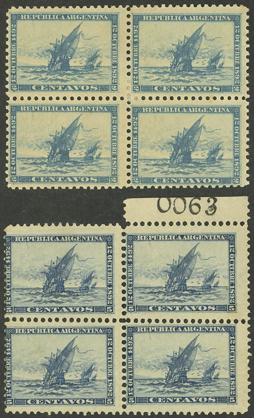 GJ.135/136, Discovery of America 400 years (ships), cmpl. set in blocks of 4, the high value without gum and with sheet number, VF quality (Image)