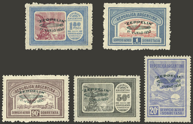 GJ.665/669, cmpl. set of 5 values with green "ZEPPELIN - 1er vuelo 1930" overprint, all of excellent quality (Image)