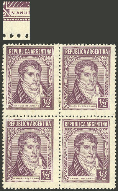 block of 4, one with VARIETY: "M" of MANUEL partially blurred (Image)