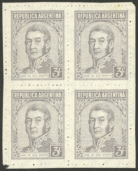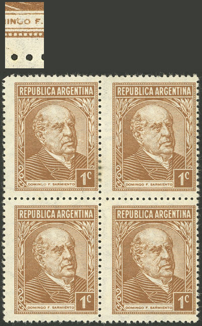 block of 4, one with VARIETY: "S" of SARMIENTO with serif (Image)