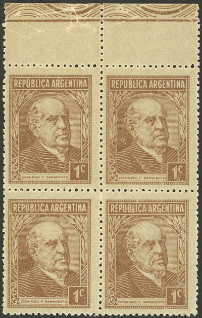 marginal block of 4, one with VARIETY: Large printing flaw on the face, with toned paper due to poor storage (Image)