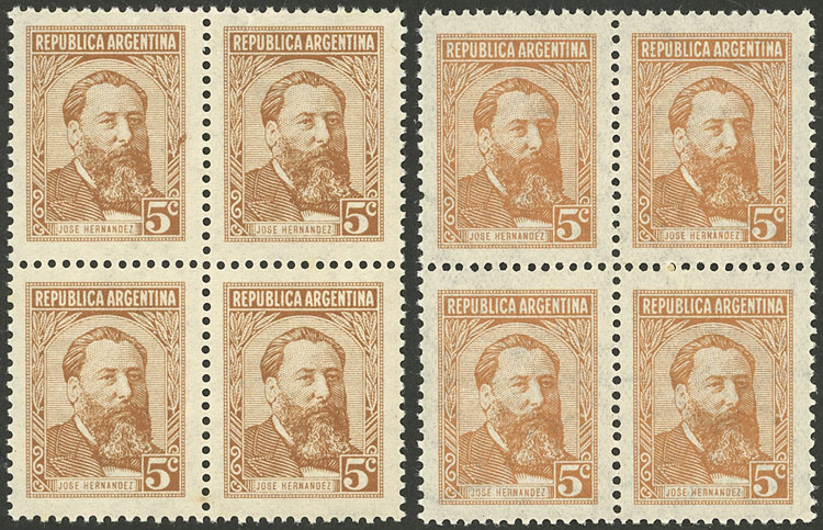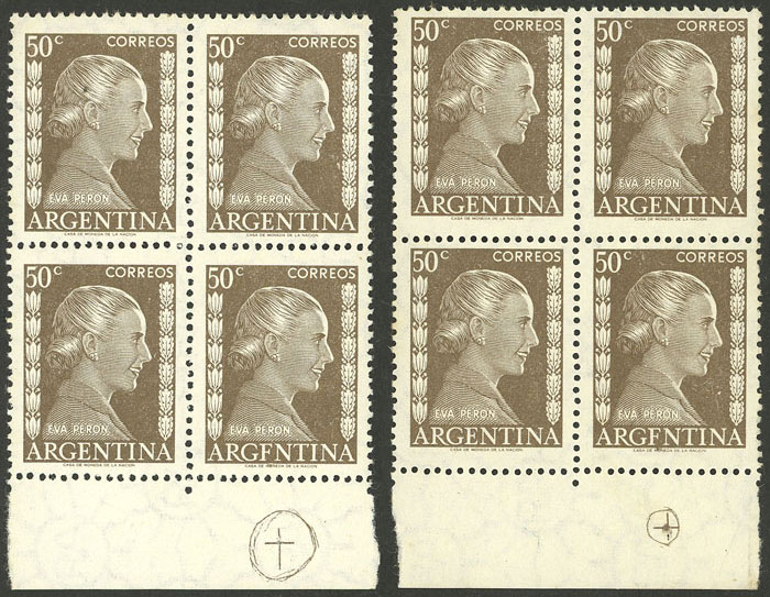 GJ.1010b, 2 blocks of 4 with "ARGFNTINA" variety, from different printings, with different mark in the margin (there are 4 types in existence) (Image)