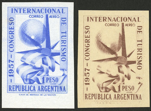 2 different PROOFS, in dun on thick yellow paper + in blue on paper with watermark, with gum (Image)