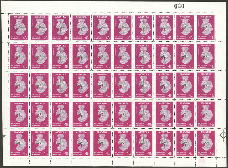 Antactica, complete sheet of 50, VARIETY: Ice floe at right of the Argentine sector (pos.9), VF quality (Image)