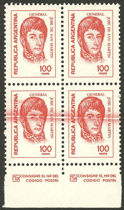block of 4 with VARIETY: color lines across the stamps below (Image)