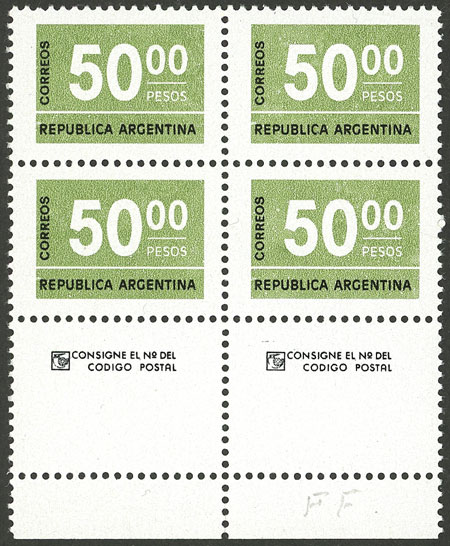 GJ.1732ACJ, $50 Figures, block of 4 printed on fluorescent chalky paper, with label below and sheet margin, excellent quality and very scarce! (Image)