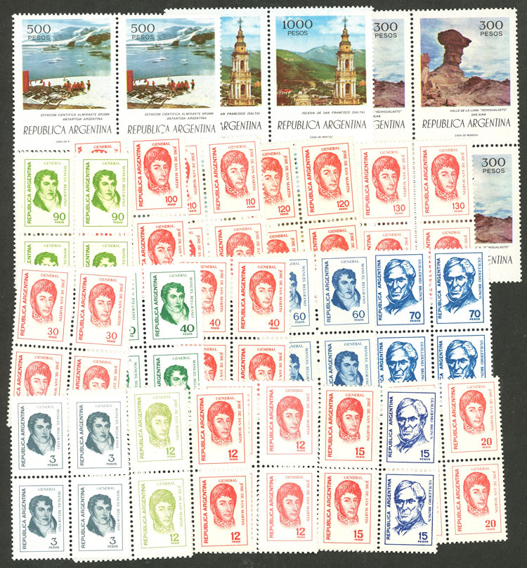 GJ.1743/1744 + 1746/1763, Proceres & Riquezas III (3rd part), 20 values in blocks of 4 of excellent quality (only missing the $12 San Martín photogravure), superb